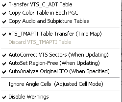 If you use Doom9's IFOUpdate guide, you'll notice a couple differences. First, I selected VTS_TMAPTI Table Transfer. If this isn't selected, it will be difficult to seek in the final output. Also, I selected Copy Audio and Subpicture Tables. Hmm was that necessary? Actually, yes it is. Look at the IFO for VTS 01: