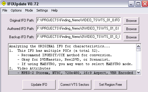 The rest of the PGCs can be done using normal IFOUpdate mode. So select Mode>Standard. All the other settings are fine the way they are (though Copy Audio and Subpicture Tables isn't necessary on this one). Set your paths correct for the next IFO (VTS 09 for Finding Nemo) and hit Update IFO. Repeat this for VTS 10 and VTS 11. No, no special procedure is necessary on VTS 11. We reauthored it to match the exact structure that it was in the original IFO, so a normal IFOUpdate will work perfectly!