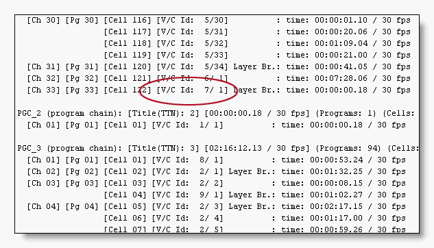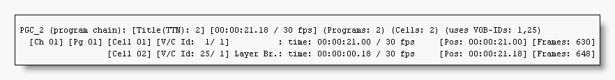 Ahh there is a 1/1. It's a cell in PGC2. And from what we can see by looking at the IFO, it's a dummy cell. How do we know this? It's length is 00:00:00.18. Less than a second long. The only 2 reasons for a cell of that length would be a slideshow or a dummy cell. If it was part of a slideshow, there would be several of these short cells in a row, which there is not. Since I know that this isn't a slideshow, it must be a dummy cell.